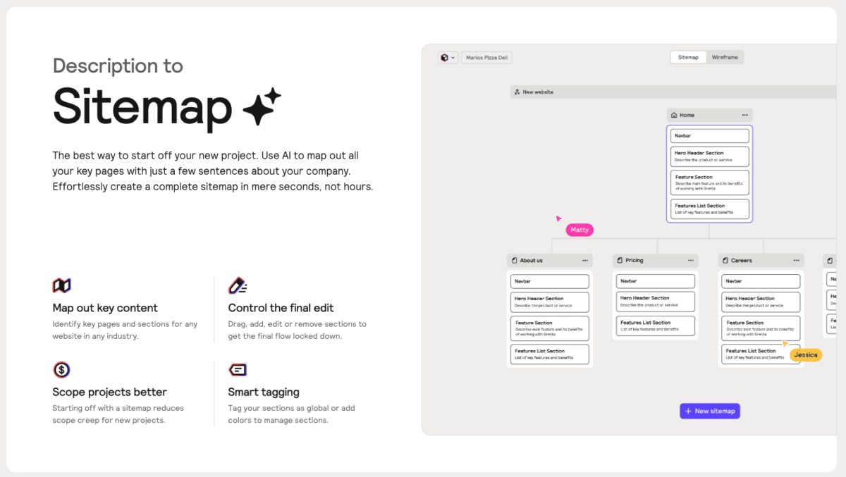 在操作介面,輸入網站主題以及內容與頁面數量後,按下Generate New Sitemap (生成新 Sitemap) ,AI 即可自動生成網站架構及內容編排, 而AI 生成結果我們也能繼續拖拉排序、編輯或手動新增內容區塊項目 (e.g. Header、Feature … 等區塊)!